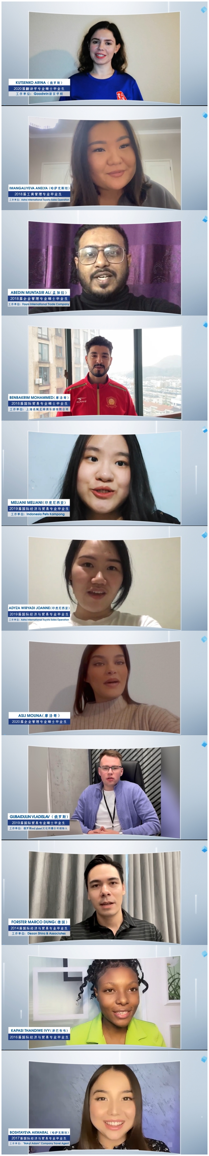 校友们立足于莫斯科红场、阿拉木图雪山、卡萨布兰卡海滨等标志性场景,在镜头前亲切问候,不仅清晰介绍了所在国家与城市,更结合当地特色文化,真挚地表达了对学院十岁生日的祝福、对恩师的感激以及对求学时光的怀念。这些视频充分展现了国际学院桃李满天下的育人成果与深厚的国际化特色。